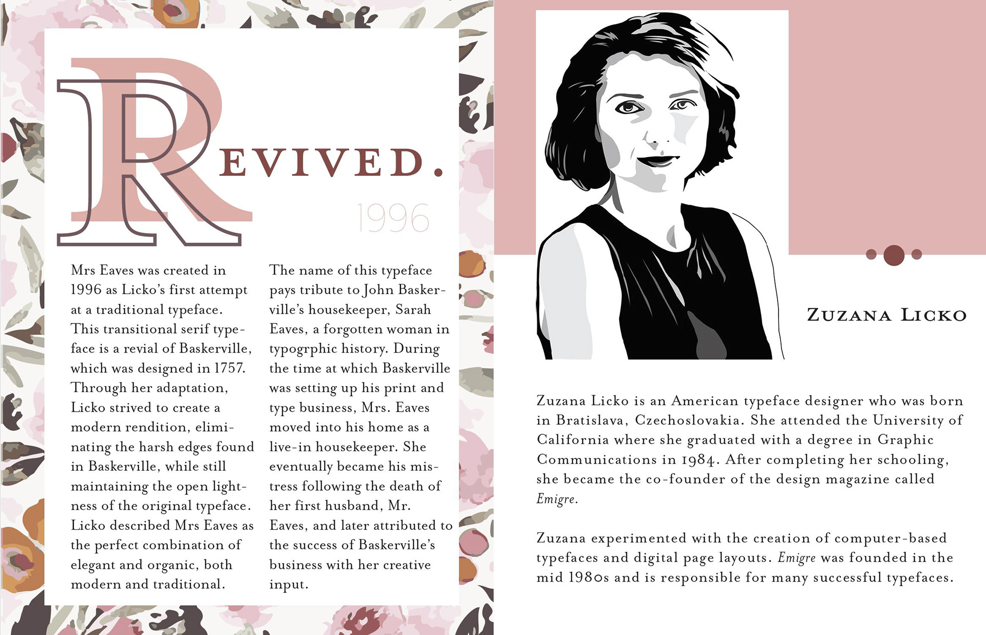The project was to design a typography handbook analyzing the history, personality and distinguishing characteristics of the chosen typeface: Mrs. Eaves.